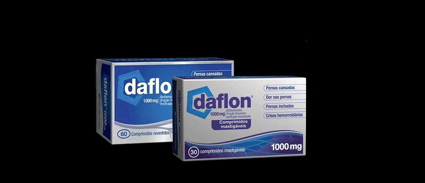 NOME DO MEDICAMENTO*: Daflon® 1000. COMPOSIÇÃO*: Bioflavonoides (Fração flavonóica purificada micronizada). Cada comprimido de 1000 mg contém: 90% de diosmina, ou seja, 900 mg; 10% de flavonoides expressos em hesperidina, ou seja, 100 mg. FORMA FARMACÊUTICA*: Comprimido revestido por película, cor de salmão e de forma oval. Comprimido mastigável de cor amarelo pálido a acastanhado mosqueada, forma redonda. INDICAÇÕES TERAPÊUTICAS*: Tratamento dos sintomas e sinais relacionados com a insuficiência venosa (pernas pesadas, dor, cansaço, edema). Tratamento sintomático da crise hemorroidária. POSOLOGIA E MODO DE ADMINISTRAÇÃO*: Posologia habitual: 1 comprimido por dia. Na crise hemorroidária: nos 4 primeiros dias: 1 comprimido 3 vezes ao dia; nos 3 dias seguintes: 1 comprimido 2 vezes ao dia; em seguida voltar à posologia de manutenção: 1 comprimido por dia. Modo de administração: o comprimido mastigável deve ser mastigado inteiro e em seguida, o que sobrar, deglutido. CONTRAINDICAÇÕES*: Hipersensibilidade à substância ativa ou a qualquer um dos excipientes. ADVERTÊNCIAS E PRECAUÇÕES ESPECIAIS DE UTILIZAÇÃO*: A administração deste medicamento no tratamento sintomático da crise hemorroidária não substitui o tratamento de outros problemas anais. Se não houver remissão dos sintomas, deve ser consultado um médico de forma a proceder-se ao exame proctológico e à revisão do tratamento, caso haja necessidade. Excipientes: Daflon® 1000comprimido revestido por película é isento de sódio e contém álcool benzílico; Daflon®1000 comprimido mastigável contém sorbitol e álcool benzílico. O álcool benzílico pode causar reações alérgicas. INTERAÇÕES MEDICAMENTOSAS E OUTRAS FORMAS DE INTERAÇÃO*: Não foram realizados estudos de interação. Da experiência de pós-comercialização do medicamento, nenhuma interação medicamentosa clinicamente relevante foi notificada até à data. FERTILIDADE, GRAVIDEZ E ALEITAMENTO*: Gravidez: Os estudos em animais não indicam toxicidade reprodutiva. A quantidade de dados sobre a utilização da fração flavonóica purificada micronizada em mulheres grávidas, é limitada ou inexistente. Como medida de precaução, o tratamento deve ser evitado durante a gravidez. Amamentação: Desconhece-se se a substância ativa/metabolitos são excretados no leite humano. Não pode ser excluído qualquer risco para os recém-nascidos/lactentes. Tem que ser tomada uma decisão sobre a descontinuação da amamentação ou a descontinuação/abstenção da terapêutica com Daflon® 1000 tendo em conta o benefício da amamentação para a criança e o benefício da terapêutica para a mulher. Fertilidade: Estudos de toxicidade em ratos machos e fêmeas não mostraram efeitos na fertilidade. EFEITOS SOBRE A CAPACIDADE DE CONDUZIR E UTILIZAR MÁQUINAS*. EFEITOS INDESEJÁVEIS*: Frequentes: diarreia, dispepsia, náuseas, vómitos. Pouco frequentes: colite. Raros: tonturas, cefaleias, mal-estar geral, erupções cutâneas, prurido, urticária. Frequência desconhecida: dor abdominal, edema isolado da face, dos lábios e das pálpebras. Excecionalmente edema de Quincke. SOBREDOSAGEM*: Sintomas: A experiência de sobredosagem com Daflon® 1000 é limitada. Os eventos adversos mais frequentemente notificados em casos de sobredosagem foram eventos gastrointestinais (tais como diarreia, náuseas, dor abdominal) e eventos cutâneos (tais como prurido, erupção cutânea). Tratamento: O tratamento da sobredosagem deve consistir no tratamento dos sintomas clínicos. PROPRIEDADES FARMACOLÓGICAS*: Daflon® 1000 exerce uma ação sobre o sistema vascular de retorno: ao nível das veias, diminui a distensibilidade venosa e reduz a estase venosa; ao nível da microcirculação, normaliza a permeabilidade capilar e reforça a resistência capilar. APRESENTAÇÃO: Caixas de 30 e 60 comprimidos. TITULAR DA AIM: Servier Portugal - Especialidades Farmacêuticas, Lda., Torre Oriente - Avª Colégio Militar 37F - Piso 6 – Fração B, 1500-180 Lisboa. Tel: 213122000. www.servier.pt. Para mais informações deverá contactar o titular de AIM. Daflon® 1000 é um MNSRM. RCMs Daflon®1000 comprimido revestido por película e mastigável aprovados em 11.2023. IECRCM 18.06.24 *Para uma informação completa por favor leia o Resumo das Características do Medicamento. Leia atentamente as informações contantes na embalagem e no folheto informativo e, em caso de dúvida ou de persistência dos sintomas, consulte o médico ou o farmacêutico.