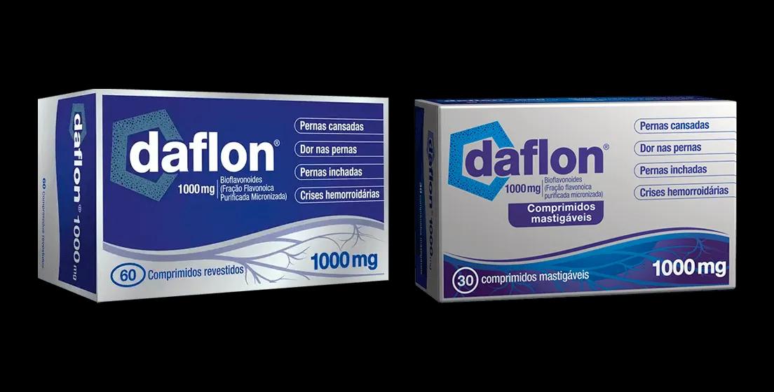 NOME DO MEDICAMENTO*: Daflon® 1000. COMPOSIÇÃO*: Bioflavonoides (Fração flavonóica purificada micronizada). Cada comprimido de 1000 mg contém: 90% de diosmina, ou seja, 900 mg; 10% de flavonoides expressos em hesperidina, ou seja, 100 mg. FORMA FARMACÊUTICA*: Comprimido revestido por película, cor de salmão e de forma oval. Comprimido mastigável de cor amarelo pálido a acastanhado mosqueada, forma redonda. INDICAÇÕES TERAPÊUTICAS*: Tratamento dos sintomas e sinais relacionados com a insuficiência venosa (pernas pesadas, dor, cansaço, edema). Tratamento sintomático da crise hemorroidária. POSOLOGIA E MODO DE ADMINISTRAÇÃO*: Posologia habitual: 1 comprimido por dia. Na crise hemorroidária: nos 4 primeiros dias: 1 comprimido 3 vezes ao dia; nos 3 dias seguintes: 1 comprimido 2 vezes ao dia; em seguida voltar à posologia de manutenção: 1 comprimido por dia. Modo de administração: o comprimido mastigável deve ser mastigado inteiro e em seguida, o que sobrar, deglutido. CONTRAINDICAÇÕES*: Hipersensibilidade à substância ativa ou a qualquer um dos excipientes. ADVERTÊNCIAS E PRECAUÇÕES ESPECIAIS DE UTILIZAÇÃO*: A administração deste medicamento no tratamento sintomático da crise hemorroidária não substitui o tratamento de outros problemas anais. Se não houver remissão dos sintomas, deve ser consultado um médico de forma a proceder-se ao exame proctológico e à revisão do tratamento, caso haja necessidade. Excipientes: Daflon® 1000comprimido revestido por película é isento de sódio e contém álcool benzílico; Daflon®1000 comprimido mastigável contém sorbitol e álcool benzílico. O álcool benzílico pode causar reações alérgicas. INTERAÇÕES MEDICAMENTOSAS E OUTRAS FORMAS DE INTERAÇÃO*: Não foram realizados estudos de interação. Da experiência de pós-comercialização do medicamento, nenhuma interação medicamentosa clinicamente relevante foi notificada até à data. FERTILIDADE, GRAVIDEZ E ALEITAMENTO*: Gravidez: Os estudos em animais não indicam toxicidade reprodutiva. A quantidade de dados sobre a utilização da fração flavonóica purificada micronizada em mulheres grávidas, é limitada ou inexistente. Como medida de precaução, o tratamento deve ser evitado durante a gravidez. Amamentação: Desconhece-se se a substância ativa/metabolitos são excretados no leite humano. Não pode ser excluído qualquer risco para os recém-nascidos/lactentes. Tem que ser tomada uma decisão sobre a descontinuação da amamentação ou a descontinuação/abstenção da terapêutica com Daflon® 1000 tendo em conta o benefício da amamentação para a criança e o benefício da terapêutica para a mulher. Fertilidade: Estudos de toxicidade em ratos machos e fêmeas não mostraram efeitos na fertilidade. EFEITOS SOBRE A CAPACIDADE DE CONDUZIR E UTILIZAR MÁQUINAS*. EFEITOS INDESEJÁVEIS*: Frequentes: diarreia, dispepsia, náuseas, vómitos. Pouco frequentes: colite. Raros: tonturas, cefaleias, mal-estar geral, erupções cutâneas, prurido, urticária. Frequência desconhecida: dor abdominal, edema isolado da face, dos lábios e das pálpebras. Excecionalmente edema de Quincke. SOBREDOSAGEM*: Sintomas: A experiência de sobredosagem com Daflon® 1000 é limitada. Os eventos adversos mais frequentemente notificados em casos de sobredosagem foram eventos gastrointestinais (tais como diarreia, náuseas, dor abdominal) e eventos cutâneos (tais como prurido, erupção cutânea). Tratamento: O tratamento da sobredosagem deve consistir no tratamento dos sintomas clínicos. PROPRIEDADES FARMACOLÓGICAS*: Daflon® 1000 exerce uma ação sobre o sistema vascular de retorno: ao nível das veias, diminui a distensibilidade venosa e reduz a estase venosa; ao nível da microcirculação, normaliza a permeabilidade capilar e reforça a resistência capilar. APRESENTAÇÃO: Caixas de 30 e 60 comprimidos. TITULAR DA AIM: Servier Portugal - Especialidades Farmacêuticas, Lda., Torre Oriente - Avª Colégio Militar 37F - Piso 6 – Fração B, 1500-180 Lisboa. Tel: 213122000. www.servier.pt. Para mais informações deverá contactar o titular de AIM. Daflon® 1000 é um MNSRM. RCMs Daflon®1000 comprimido revestido por película e mastigável aprovados em 11.2023. IECRCM 18.06.24 *Para uma informação completa por favor leia o Resumo das Características do Medicamento. Leia atentamente as informações contantes na embalagem e no folheto informativo e, em caso de dúvida ou de persistência dos sintomas, consulte o médico ou o farmacêutico.